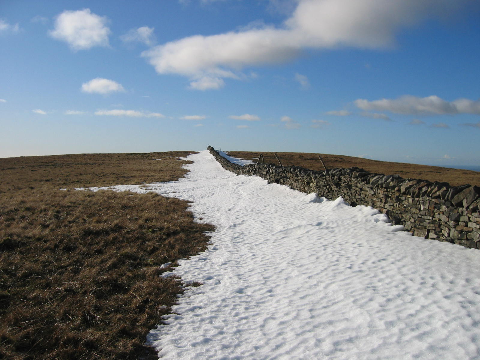 On emerging at the top follow the wall to a junction with another wall whereupon step over recent stone stile to turn right and immediately over a wooden stile walking for a short distance to reach the trig point of Crag Hill [682m]. The views across Morecambe Bay including Heysham and Barrow are excellent in good weather whilst in the other direction there is a good vista of the Lake District fells. Retrace steps and to the stile. Pass over the stile and proceed along the crest of the hill with the wall on the left and after 500m or so the diminutive cairn of Great Coum [687m] will be seen on the other side of the wall. This is in fact very slightly higher than Crag Hill and yet has no trig point. Continue to a change in direction of the wall as the wall turns to the right and in a southerly direction. The path starts to drop downhill. There are several stiles in the wall and at some point cross to the other side of the wall still in the same direction. This passes the rocky outcrop of Gatty Pike and a short distance further on look for a large boulder located at the intersection of two walls. This is County Stone the one time intersection of 3 counties being the extremity of Lancashire, West Riding and Westmoreland. These days it is the intersection of Lancashire and Cumbria. Continue until the next broken down wall and then descend diagonally down hill to the far corner of the pasture where there is a stile. Passing over the stile turn left on to the Occupation Road. Follow the track for 1.5 miles. Then turn right along Nun House Outrake a stony track. This eventually emerges at Deepdale Lane. Cross the lane and through the farm gate opposite. Walk downhill for 200m towards the farmhouse at Scow. Turn left passing across several fields and running parallel with Deepdale Beck. Eventually dip down through the trees towards Mill Bridge. Crossing the minor road take the signposted path towards Dent following the beck. This eventually meets the River Dee and then follows the river almost to Dent.