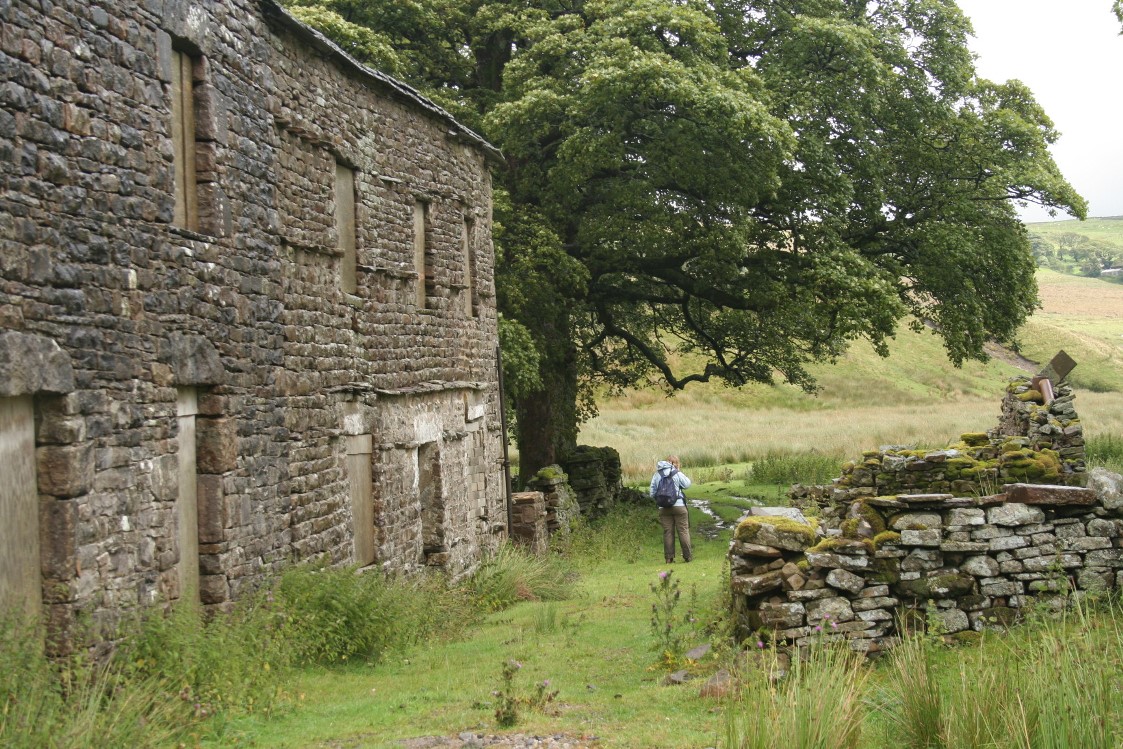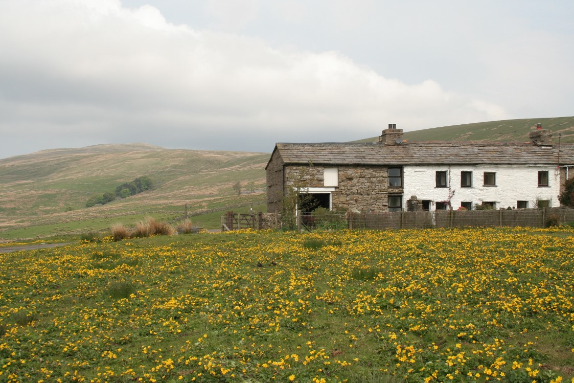 Bear left at the church and passing through a stile over Cowshaw Hill and two more stiles. This now becomes difficult to follow and some map reading is required! With the pasture boundary on the right look for a stile at the slight change in direction. Turn right to pass over the stile and then immediately left passing over very rough pasture towards Blades, a small hamlet of cottages. The path has been redirected pass to the left (rear) of the farmhouse through two stiles and crossing a small stream joins the farm access track. At a right hand bend in the track go straight on following the left hand bank of the River Ure. Eventually the path will meet Ure Force waterfalls and an old bridge with it's modern replacement alongside. Cross the bridge and follow the Pennine Bridleway to the Moorcock Inn. Please note that this latter option whilst having the attraction of a visit to Shaws waterfall and Lunds Church can be unpleasantly muddy between Lunds and Blades Farm.