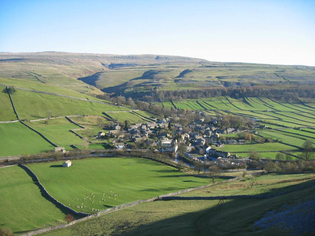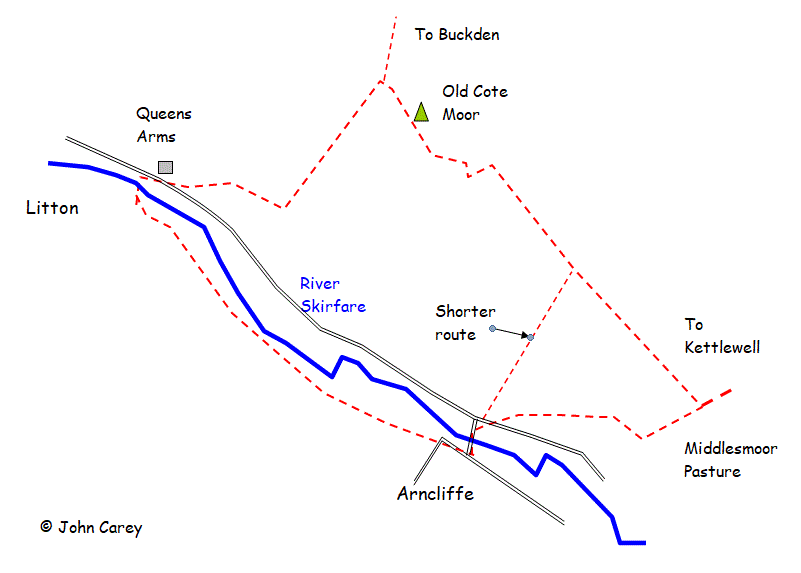 Start at Arncliffe village green passing out of the village near to the church. After the river bridge a path cuts a corner of two roads to cross the Hawkswick road and through another stile proceeding up the hill. The path goes through a copse and passes through a gap in a rocky outcrop. The path is well defined until emerging at the top of the hill at which point cross the stile and turn left along ridge with wall on left. After 2 miles or so the wall will need to be crossed (shortly after an intersection with another wall - please study the map for this bit!) and some careful navigation will be required around a dog-leg.
