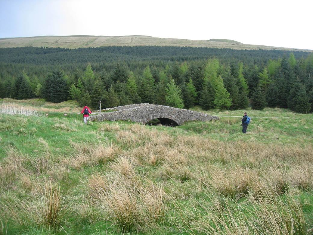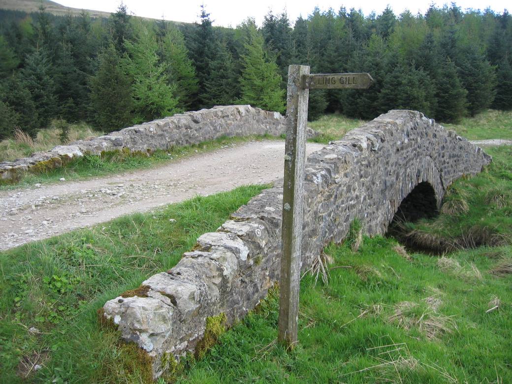 Follow Roman road to Cam End (overlooking Ribblehead) and turn left along track for about 1/2 mile to meet Ling Gill. After Ling Gill bridge continue along track for 400m and bear left up hillside to poorly defined path. This soon follows a wall to cross a stream near a shepherd's hut. Continue slightly uphill with wall on right until forest reached. Follow path through forest until vehicle track reached (near bridge). Turn left along track to reach minor road at Greenfield. Walk along road for 1 ½ miles (there is no alternative).
