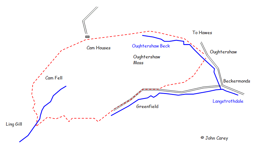 Start at Oughtershaw - there is a grass lay-by on the hill on the road going towards Hawes. Walk down the hill and turn right along vehicle track (actually the Dales Way) passing Nethergill and Swarthgill Farms. The track becomes a path leading slightly up the hillside to reach Cam Houses. Thence walk through corner of dense forest to reach Roman road at top of hill.