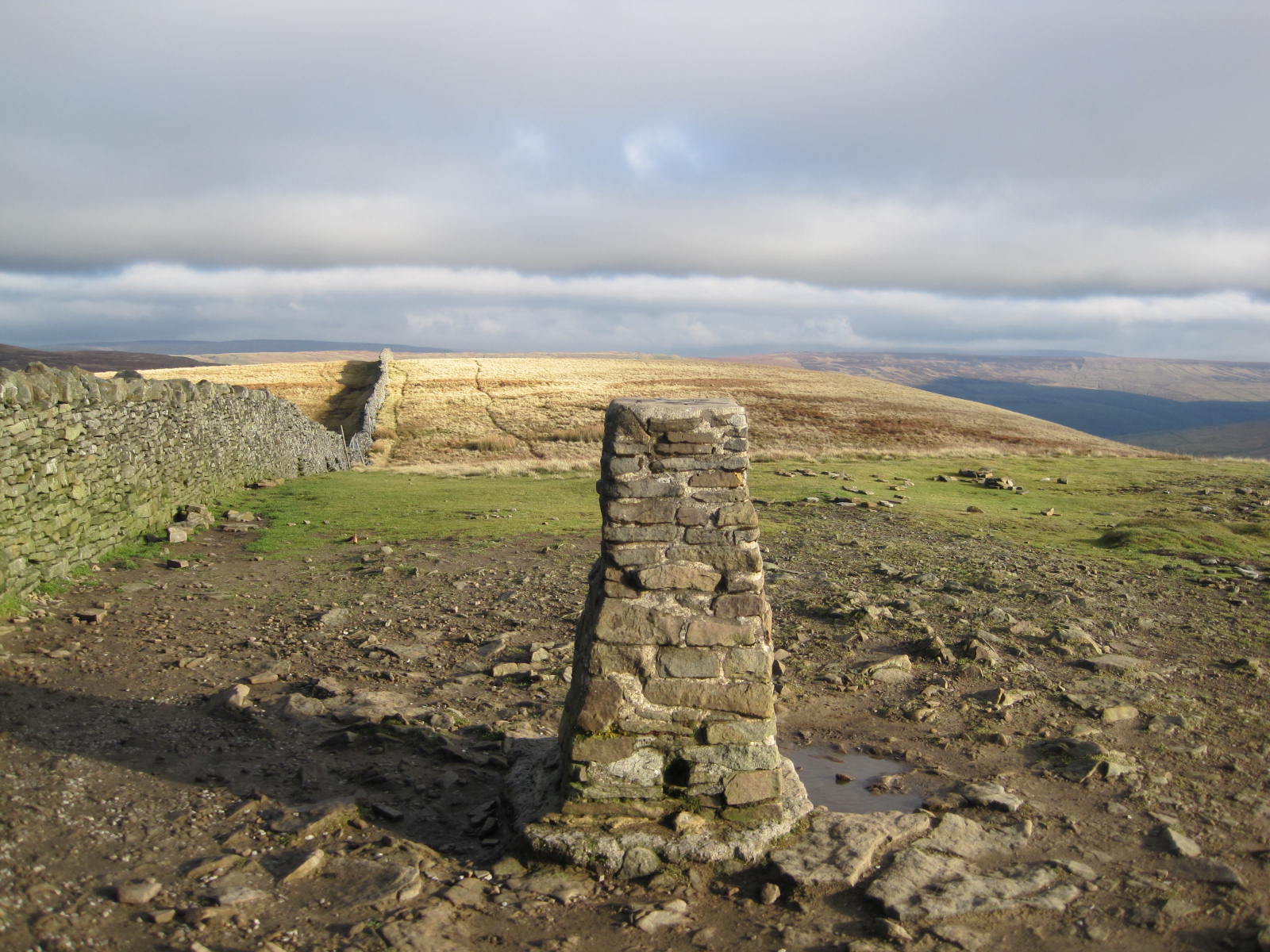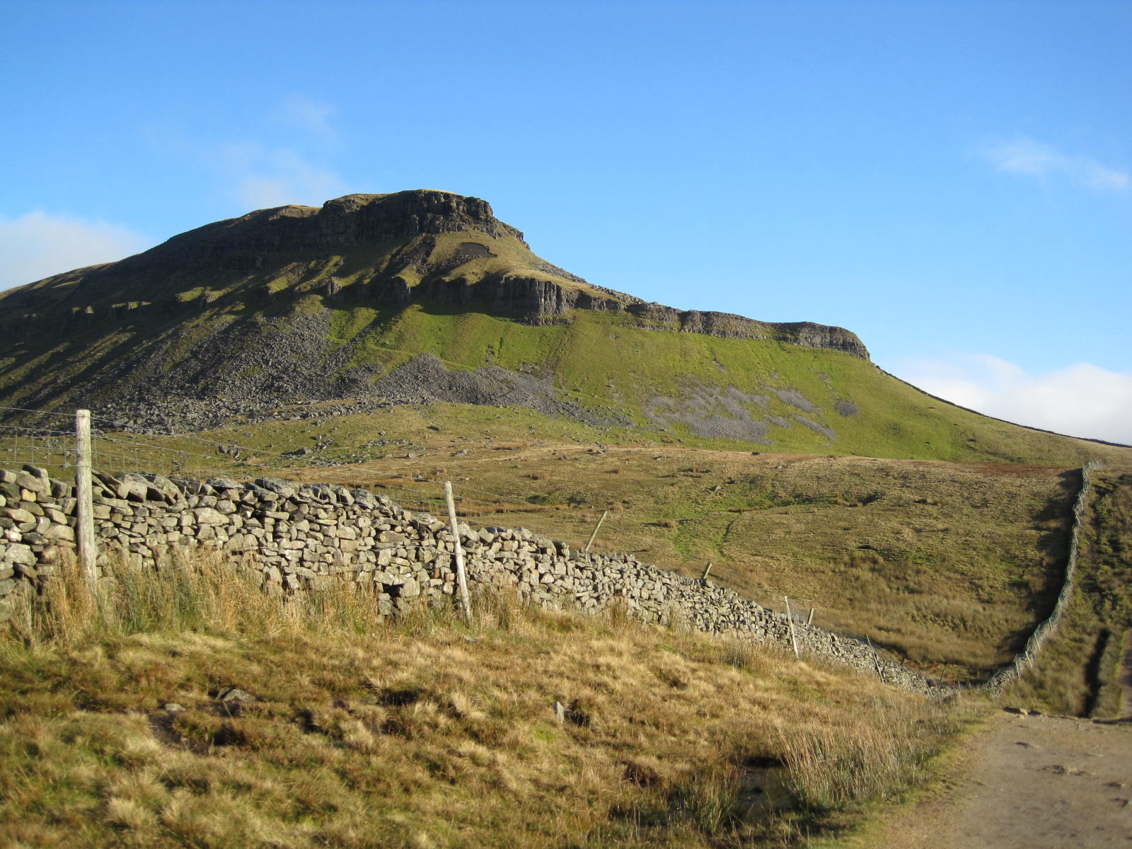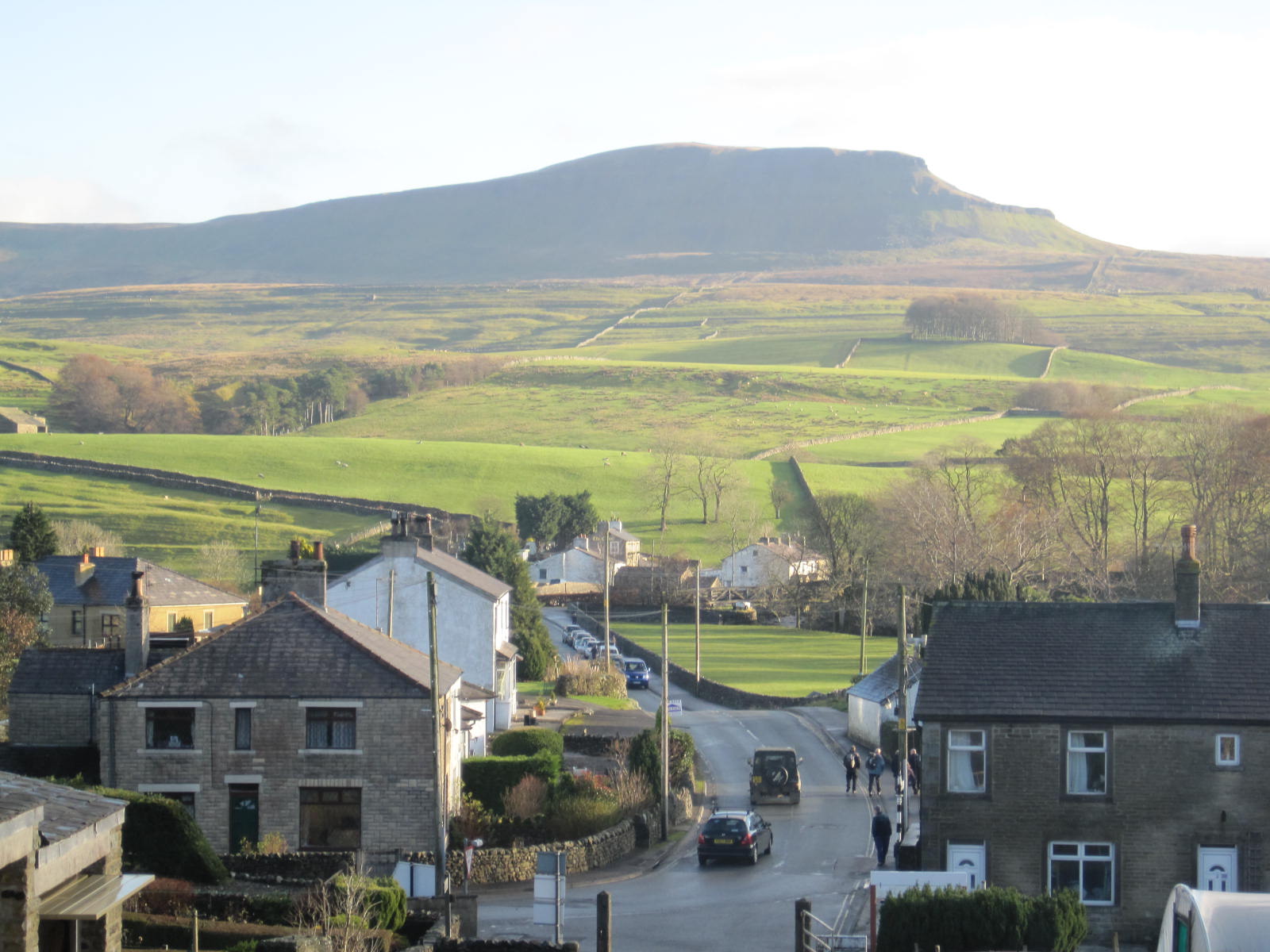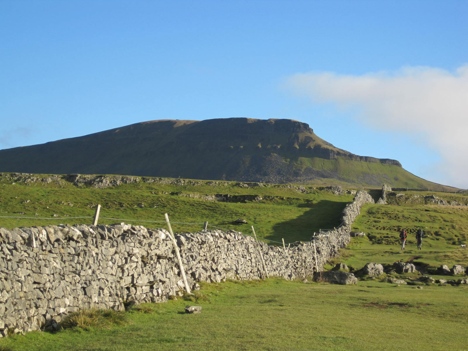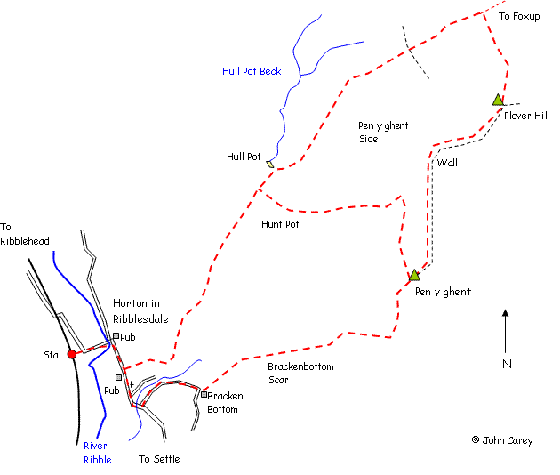 Commence at Horton Station walking down the station access road and straight on along the main road towards the village. Bear right across the footbridge avoiding the narrow road bridge and regain the main road passing the Golden Lion and the church. Take the second turning left after the church and walk up the lane towards Bracken Bottom. Just before Bracken Bottom farm turn let on to the 3 peaks path to the summit of Pen y Ghent. This rises steadily uphill through a rocky outcrop and two stiles always with the wall on the left. Eventually the crest of the hill will be reached. Pass through the gate and turn left scrambling up the path to the summit of Pen y ghent and the trig point. Take a while to admire the views in all directions.