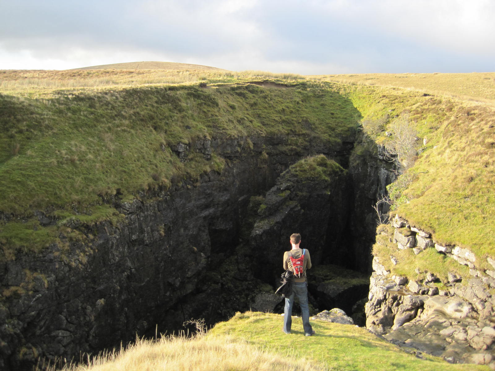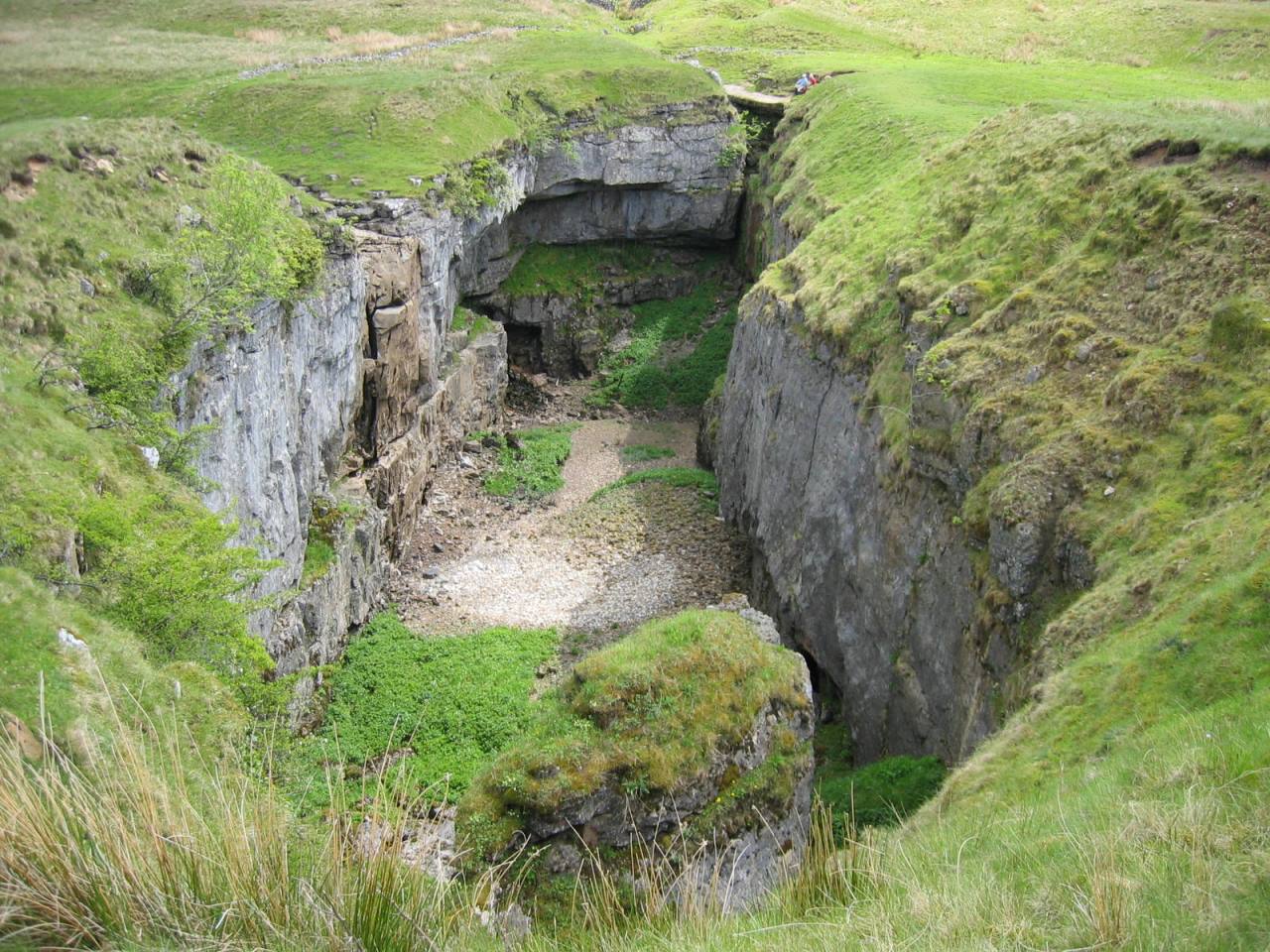 Pass over the stile and if taking the shorter option and take the well surfaced path straight ahead down to a gate and a stony vehicle track. Turn left and follow this track all the way back to Horton and the main road, Turn right at the main road and back to the station. However, if taking the longer option pass through the stile on leaving Pen y Ghent trig point and follow the crest of the hill with the wall on the right eventually arriving at Plover Hill. From Plover Hill bear left as the well worn grassy path descends steeply down the hillside to meet the Foxup path at the bottom. Turn left again and follow the path to which eventually becomes a stony vehicle track and thence back to Horton as described above. It is worth taking a moment to visit Hull Pot a large crater to the right of the path.